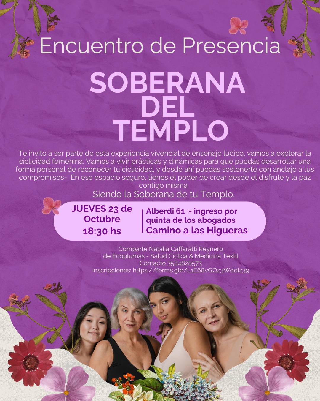 Compartiremos Prácticas para sentir la presencia en tu cuerpo, registrar tu ciclicidad, habitar con gozo con tu fertilidad al servicio de lo que desees, ya sea gestar y parir proyectos creativos o crianzas humanas. Una experiencia que brinda la oportunidad de llamar a nosotras nuestra energía desparramada en el multiverso.